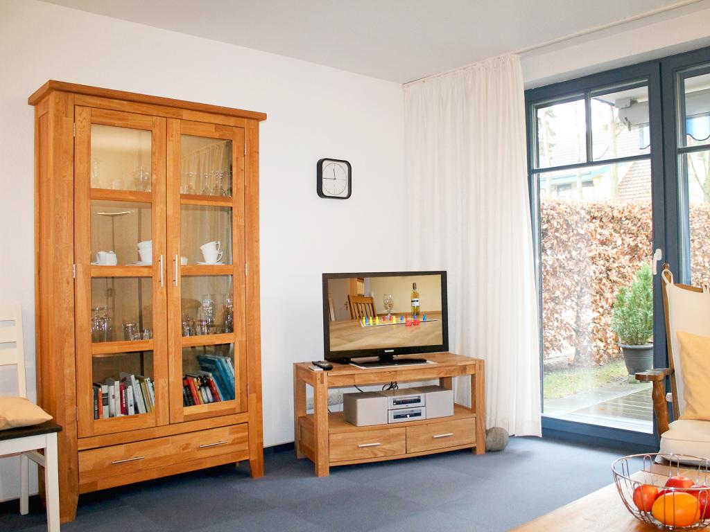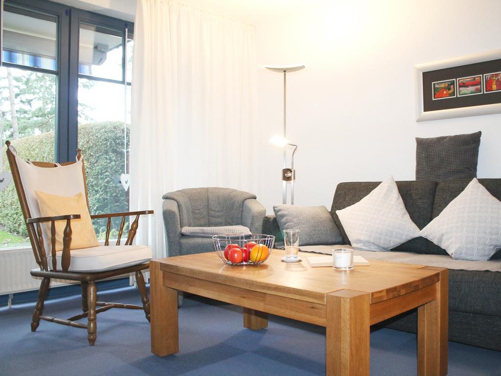 Das 2-Zimmer-Appartement befindet sich im Erdgeschoß und ist eine Eckwohnung. Im kombinierten Wohn- /Esszimmer befinden sich eine gemütliche Schlafcouch mit einer Liegefläche von 180×200 cm, eine Essecke sowie TV und Stereoanlage mit CD-Player. Die integrierte Küche ist mit Geschirrspüler, Kaffeemaschine und Toaster ausgestattet.
