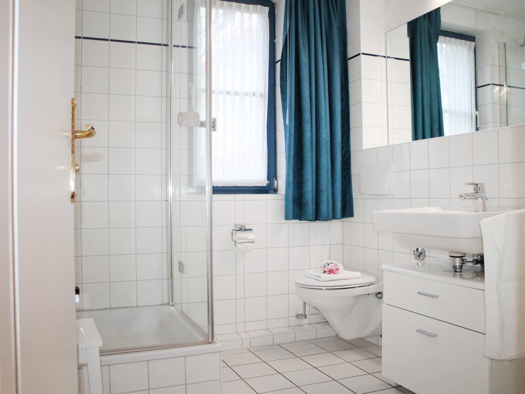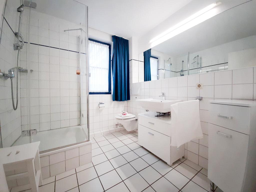 Im großen Bad befinden sich eine Dusche, Waschbecken und WC. Vom Wohnbereich aus gelangen Sie auf die sonnige Terrasse, die auf der Südseite der Ferienanlage Papillon gelegen ist.
